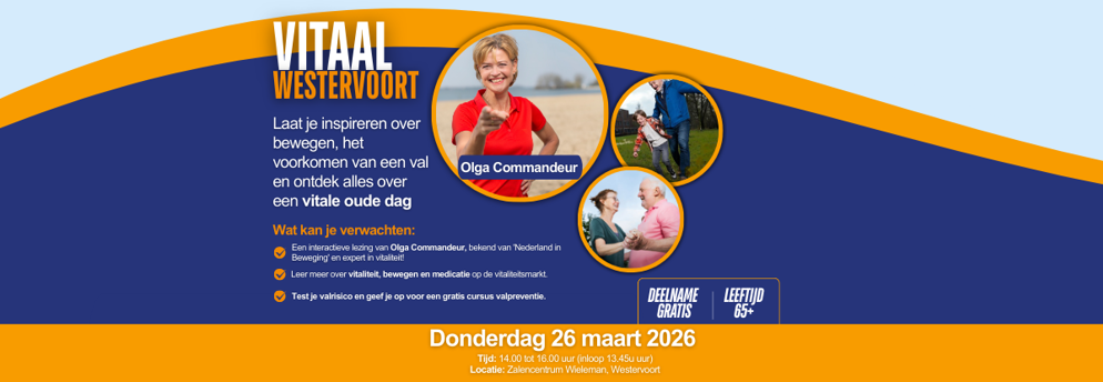 Tijdens Vitaal Westervoort ontdekken 65-plussers uit Westervoort hoe leuk, belangrijk én eenvoudig het kan zijn om vitaal ouder te worden. Het programma zit boordevol inspiratie, praktische tips en vooral veel beweging. Met een interactieve lezing van Olga Commandeur, een uitgebreide vitaliteitsmarkt en een energieke beweegclinic is er voor iedereen iets te beleven.