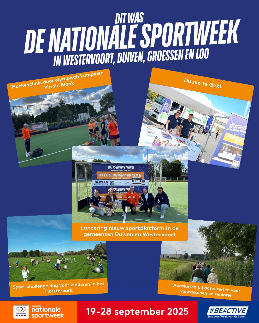 Terugkijkend was de Nationale Sportweek een groot succes. Honderden inwoners werden in beweging gebracht, leerden nieuwe sporten kennen en ontdekten hoe leuk het is om samen actief te zijn. Het beweegteam kijkt met trots terug en hoopt veel deelnemers ook de komende periode weer terug te zien bij sport- en beweegactiviteiten in de gemeenten. Houd onze kanalen in de gaten en sluit aan – samen maken we Duiven en Westervoort nóg fitter en vitaler!
